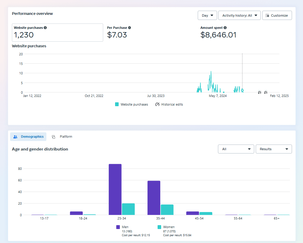 Through strategic management of Facebook and Instagram advertising, I significantly boosted a beauty and skincare brand’s revenue. By meticulously targeting high-value audience segments and developing compelling ad creatives, I achieved a remarkable 2,250% return on ad spend (ROAS). Specifically, an investment of $43,789.80 yielded a substantial $985,950.85 in revenue, translating to over $22 in revenue for every dollar spent.