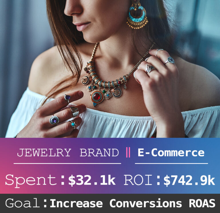 The Jewelry Brand campaign aimed to increase conversions (sales of high-end jewelry pieces such as rings, necklaces, bracelets, and custom pieces) while maximizing return on ad spend (ROAS). With a focus on elegant and timeless designs, the goal was to showcase the craftsmanship of the jewelry and position it as a luxurious, must-have accessory for special occasions and gifting.